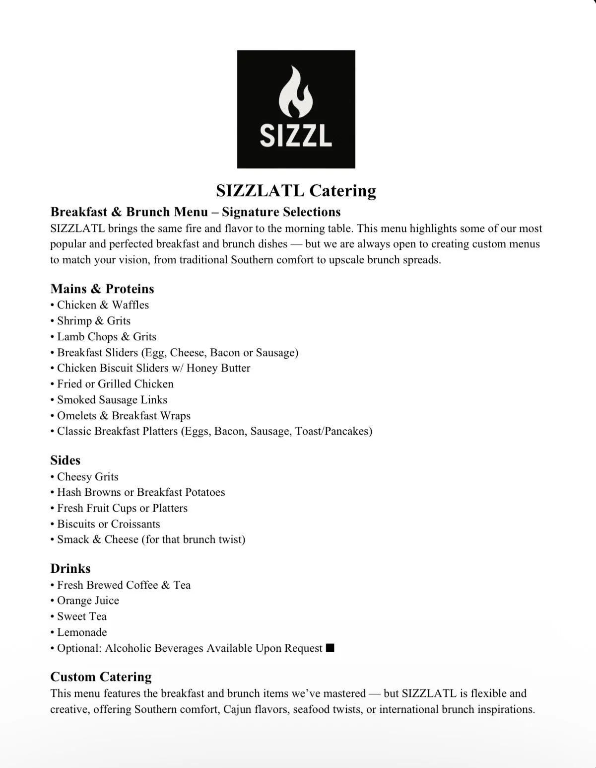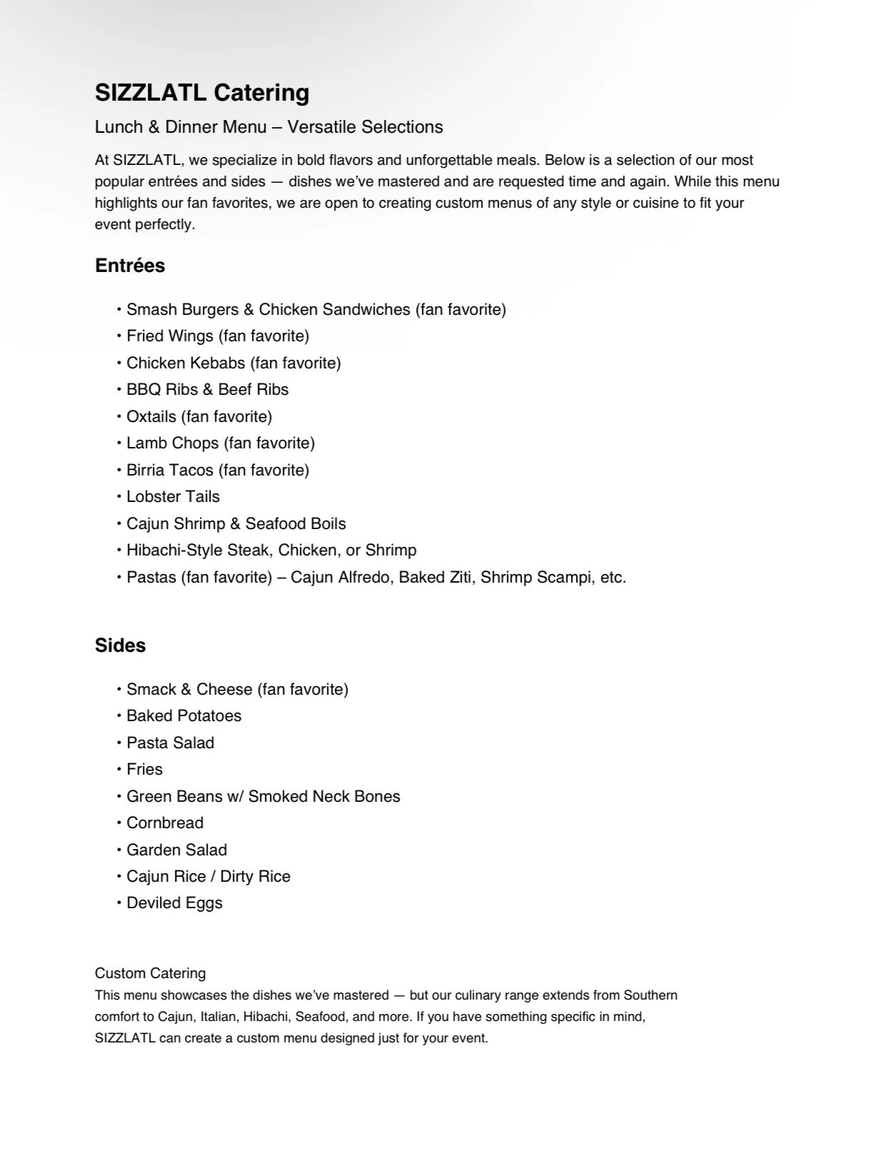 At SIZZLATL Catering, every dish tells a story — your story. Our menus feature crowd favorites that guests love, but no two events are ever the same. We customize every detail to match your vision, your flavor, and your vibe. From birthdays to luxury events, if you can dream it, we can cook it — because at SIZZLATL, we don’t just serve meals, we serve memories.